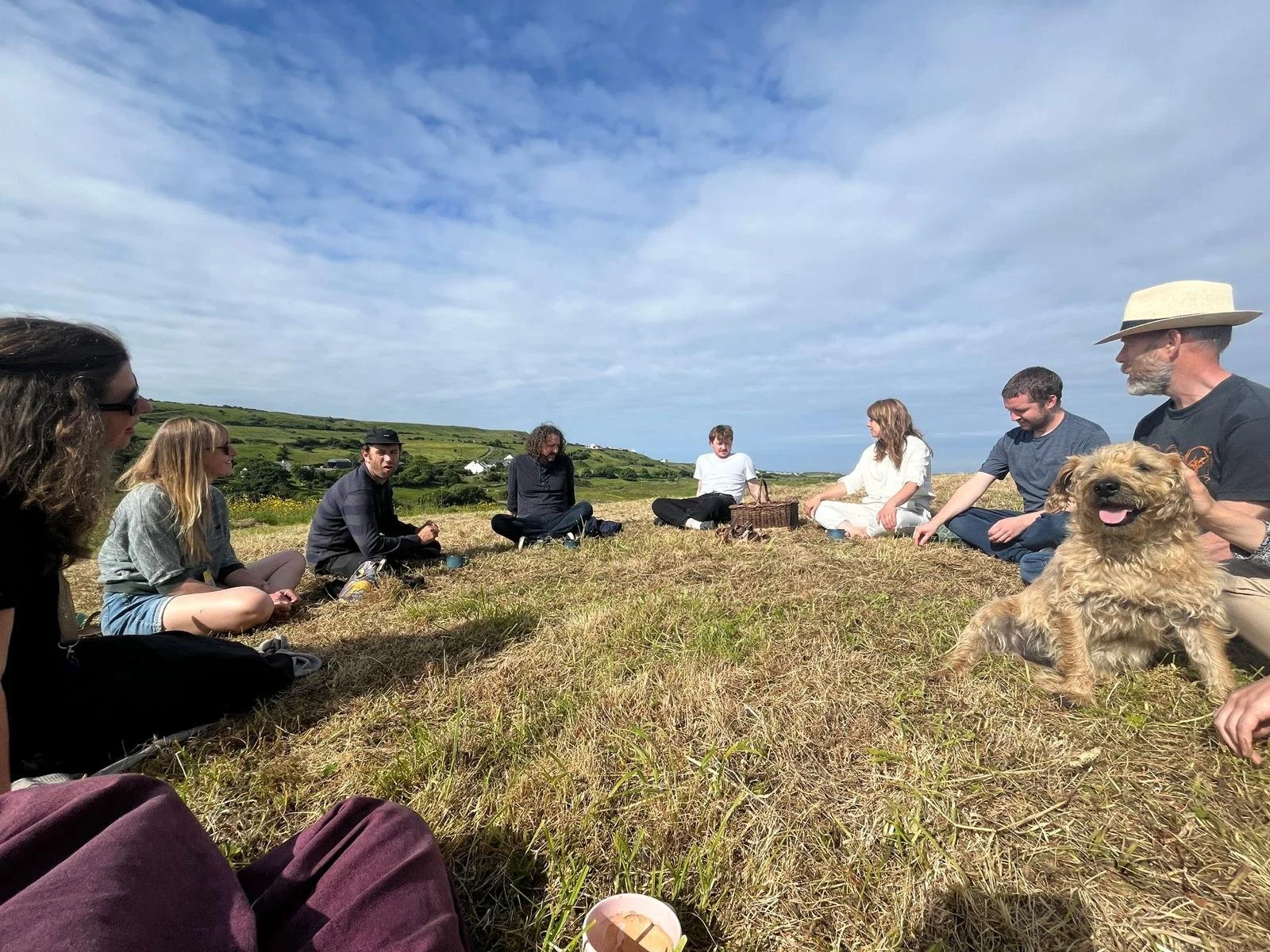 Members of the Dinnseanchas project gathering in one of the Hometree meadows during the Ardnaculla Summer School.